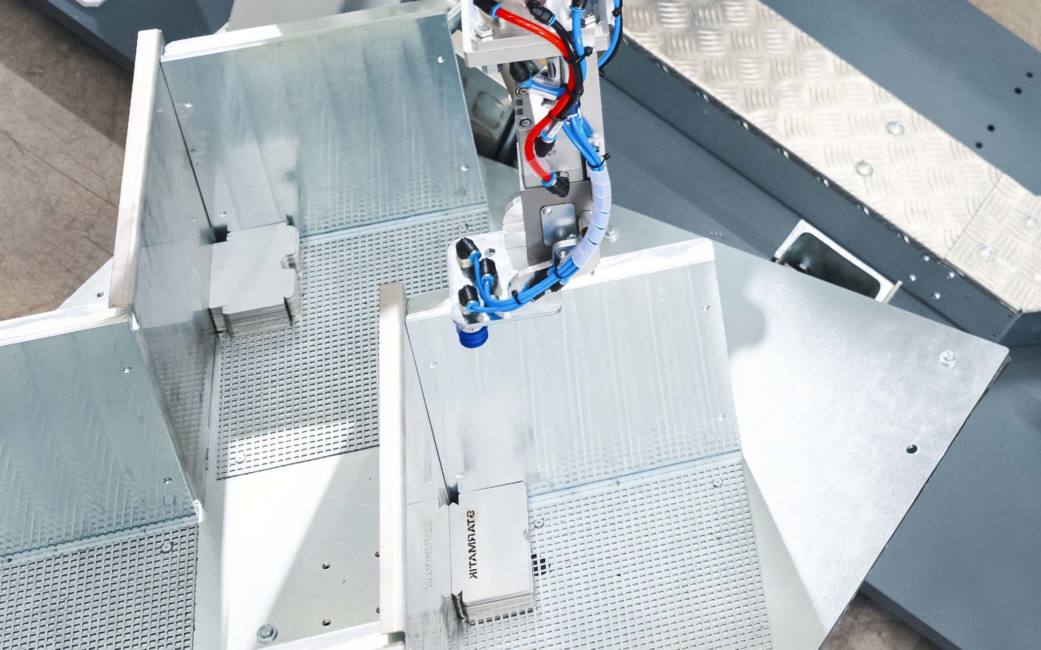 La MBS, diseñada para una alta productividad de piezas pequeñas, está equipada con un dispositivo de agarre estándar, con ventosas y pequeñas pinzas mecánicas, idónea a manipular el 90% de las piezas pequeñas.